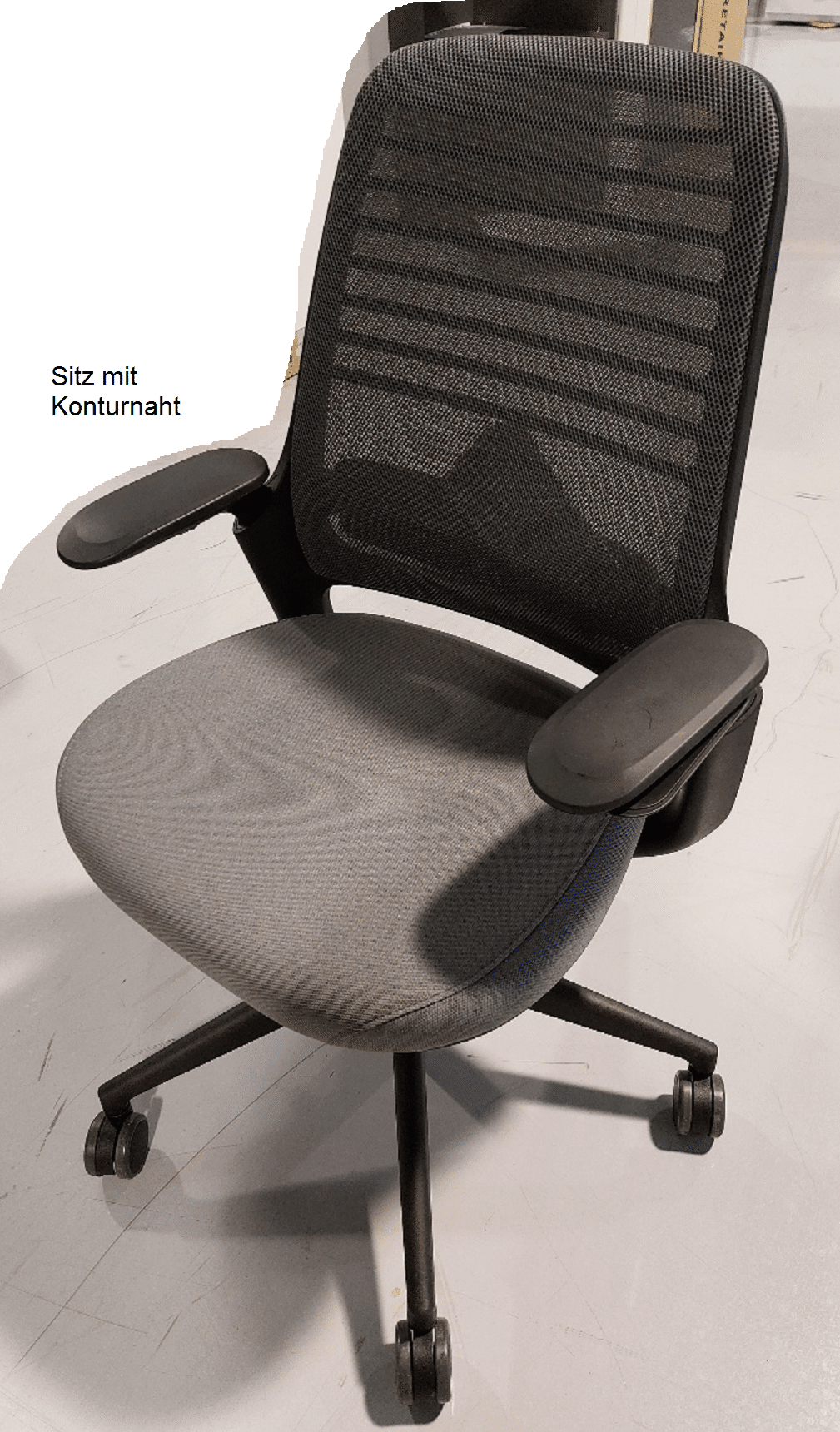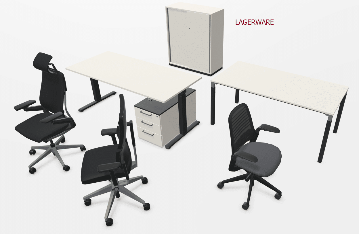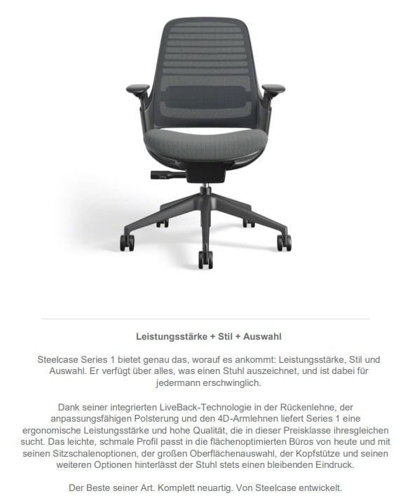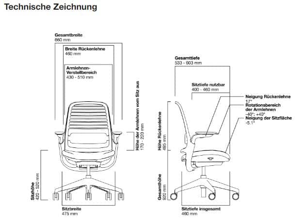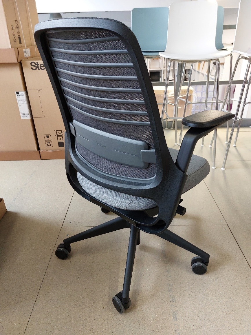 - Ergonomischer Stuhl – mit anpassbarer Sitztiefenverstellung, individuell einstellbaren Armlehnen, höhenverstellbarer Lumbalunterstützung, Sitzhöhenverstellung (mittels Gasfeder), Sitzpolster mit Stoff und Netz-Rückenlehne, Einstellung des Neigungswinkels der Rückenlehne
